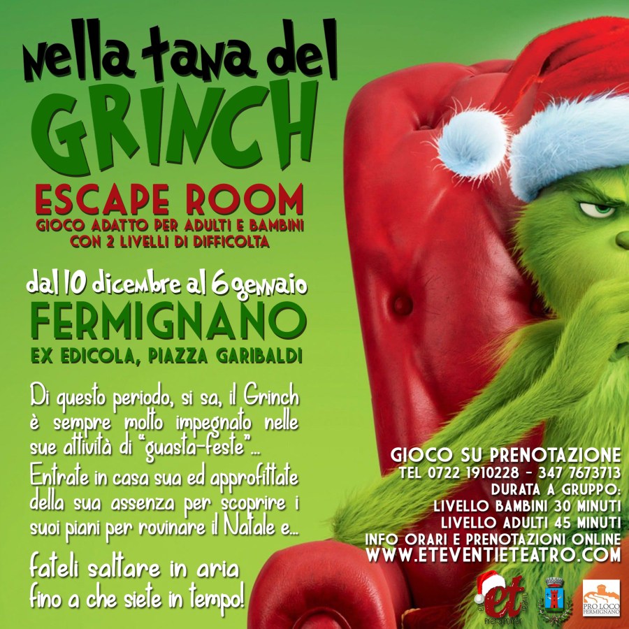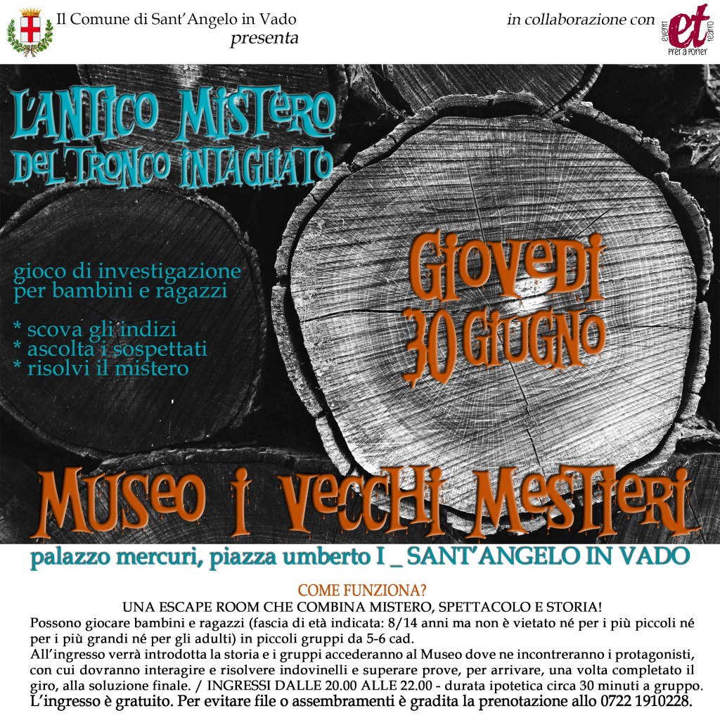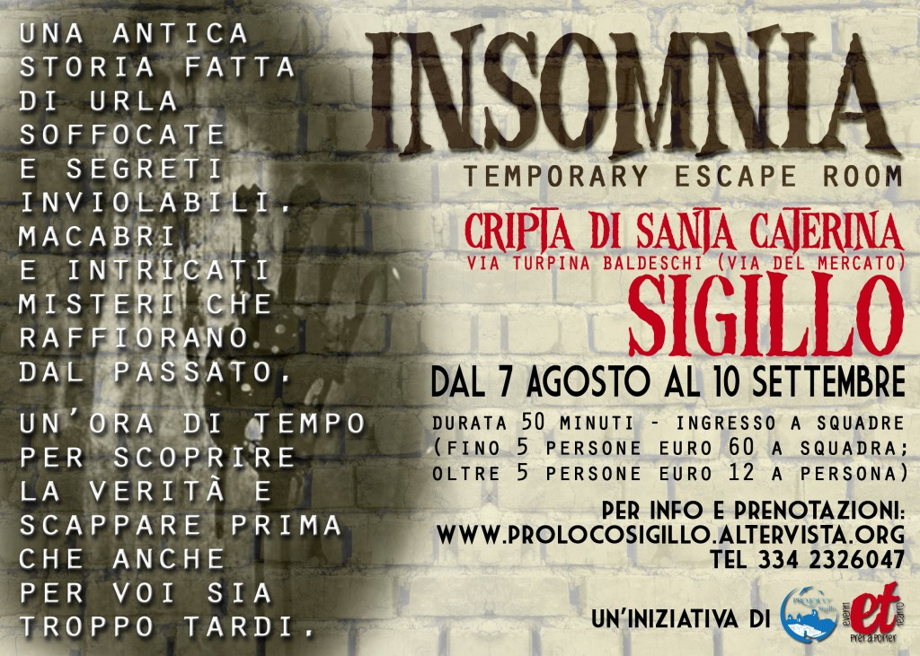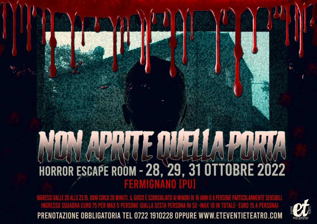 BIANCO SANGUE Riuscirete a scappare dall’incubo prima che sia troppo tardi? Fermignano, 1872. Il Mattatoio comunale è stato inaugurato da pochi mesi… Una bambina troppo curiosa, a cui era stato vietato di avvicinarsi a quel posto di morte e sangue, una sera non fa più ritorno a casa. Il suo corpo non è mai stato ritrovato… La sua storia è rimasta sepolta nel mistero per quasi 150 anni… Sei pronto ad addentrarti dentro ai peggiori incubi di Caterina per scoprire la verità? Ma attenzione: soltanto i più temerari riusciranno ad uscirne. COME FUNZIONA: – si entra i gruppi da un minimo di 2 ad un massimo di 6 persone – ogni gruppo ha a disposizione 45 minuti di tempo per riuscire a trovare le chiavi e SCAPPARE – ingressi ad ogni ora, a partire dalle 20.00 di venerdì 28 ottobre (sabato 29, domenica 30 e lunedì 31 ingressi dalle 16.00); per tutte le giornate: ultimi ingressi alle ore 23.00 – prenotazione obbligatoria al 328/8656808 oppure online suhttps://eteventieteatro.com/prenotazioni-online/