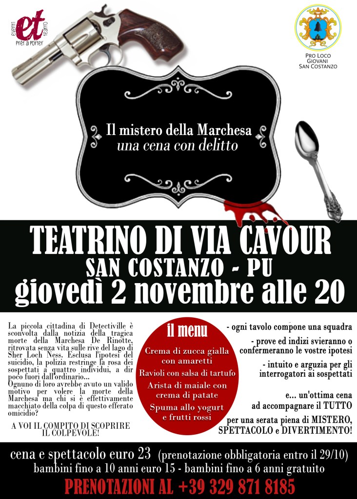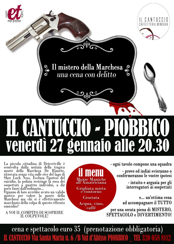 Noi siamo pronti per la prossima cena con delitto: buon cibo, spettacolo e gioco, per una serata all’insegna del mistero e del divertimento.